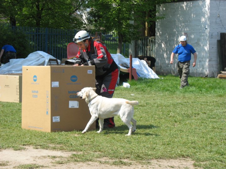 Zosunutie panelov a možno zavalená osoba! Zaznelo areálom. Psovodi a hasiči sa presúvajú na miesto určenia. Psovodi so psami dvakrát overujú miesto, či sa nejedná o planý poplach. Každý pes potvrdil nález. Teraz prišla na rad technika HaZZ , pomocou navijaku sa podarilo pridvihnúť panel a desať ročného chlapca vyslobodiť spod zeme.